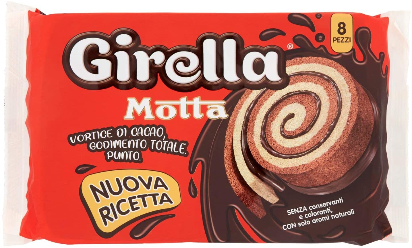 Motta Girella Cacao, 8 snacks de 35g. Motta Girella Classica Al Cacao en paquet de 8 pivots – 280 grammes au total. Savourez le goût du cacao classique Motta Girella, l’inimitable ! La légendaire Girella Motta est le meilleur tourbillon de cacao du monde. Ingrédients : Farine de blé, sucre, œufs, huiles et graisses végétales (palme, coco, palmiste), sirop de glucose-fructose, dextrose, poudre de cacao maigre, poudre de cacao (2,3%), poudre de lait écrémé, émulsifiants : mono- et diglycérides d’acides gras – lécithine de soja, alcool, pâte de noisettes, poudre à lever : diphosphate disodique – hydrogénocarbonate de sodium – phosphate monocalcique, sel, conservateurs : acide sorbique, arômes. Peut contenir des traces d’autres fruits à coque. Sans conservateurs ni colorants, uniquement des arômes naturels.