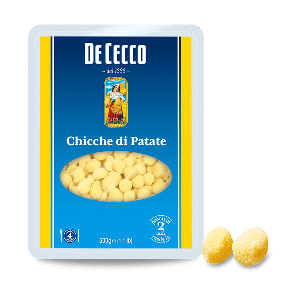 Pommes de terre De Cecco Chicche, 500 g. Les Chicche sont une alternative savoureuse aux Gnocchi classiques, un plat typique de la tradition italienne. Né de la recette originale qui combine les pommes de terre.Ingrédients : Purée de pommes de terre 80 % (eau Flocons de pommes de terre déshydratés 24% (pommes de terre 99%, épices)) Fécule de pomme de terre 15 %. Farine de blé Farine de riz Épices Épices Sel Correcteur d’acidité : acide lactique Conservateur : Sorbate de potassiumStockage : Conserver dans un endroit frais et sec. Après ouverture, conserver au réfrigérateur (+4°C) et consommer dans les 3 jours.Temps de cuisson : – Cuisson 2 minutes